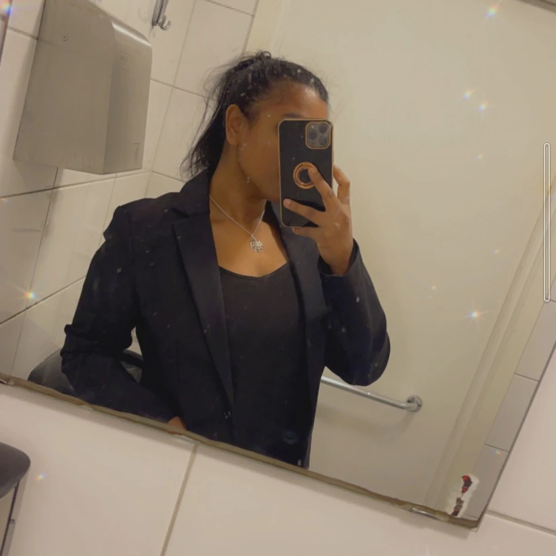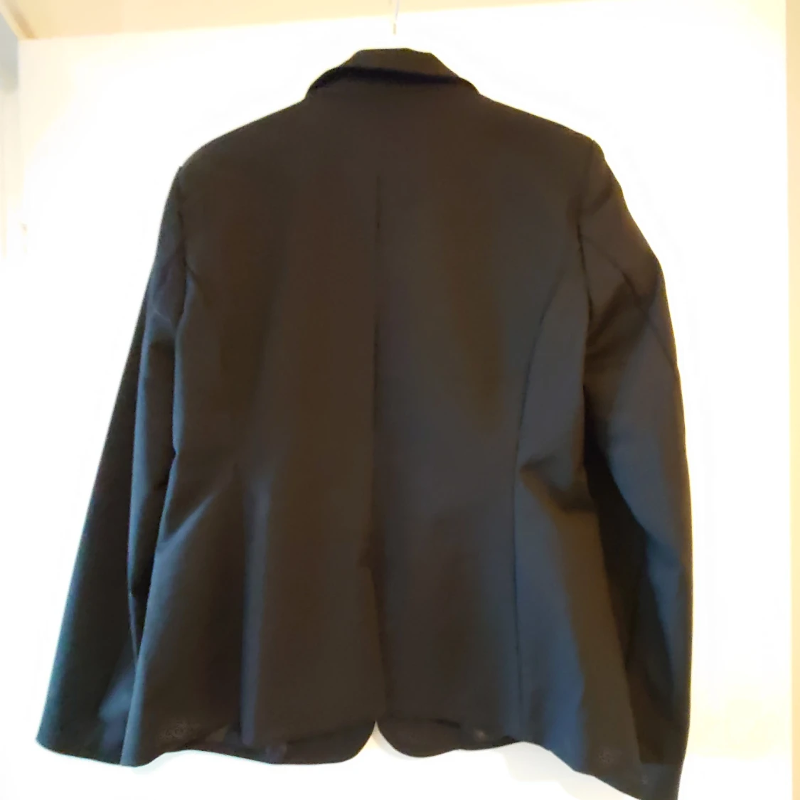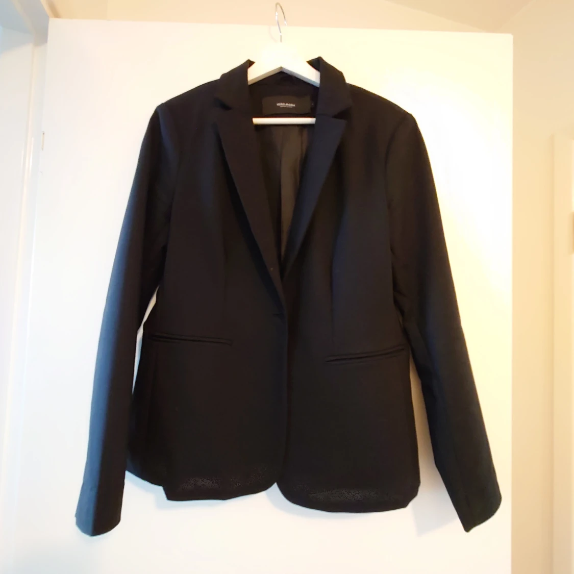 En elegant svart kavaj från H&M i storlek medium. Kavajen har en klassisk design med långa ärmar och två fickor framtill. Perfekt för både formella och semi-formella tillfällen.