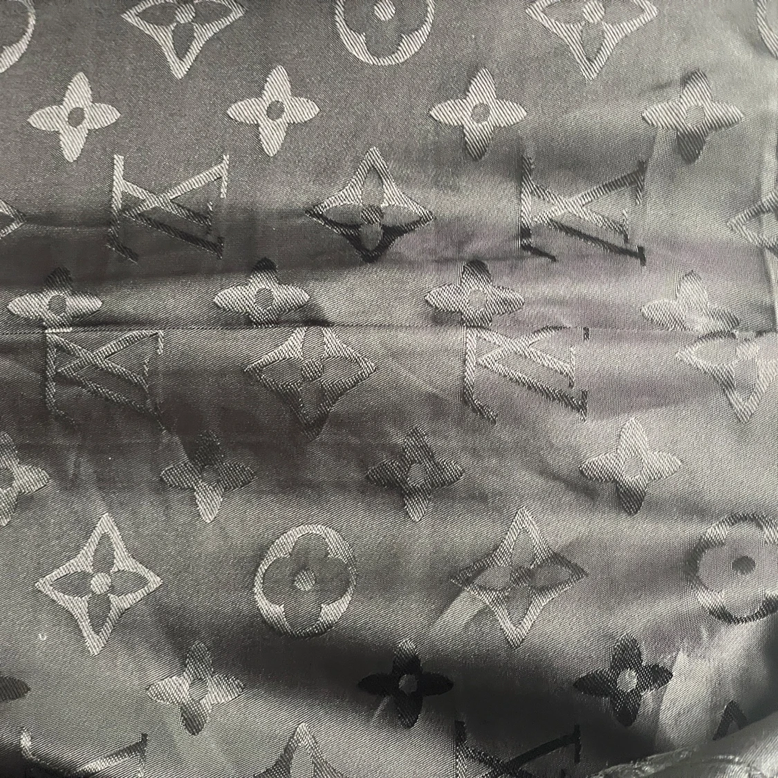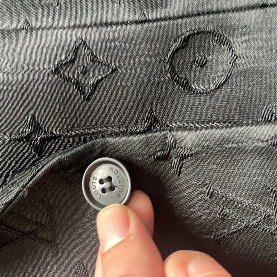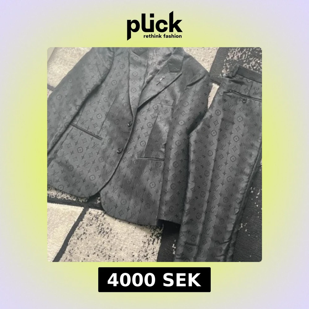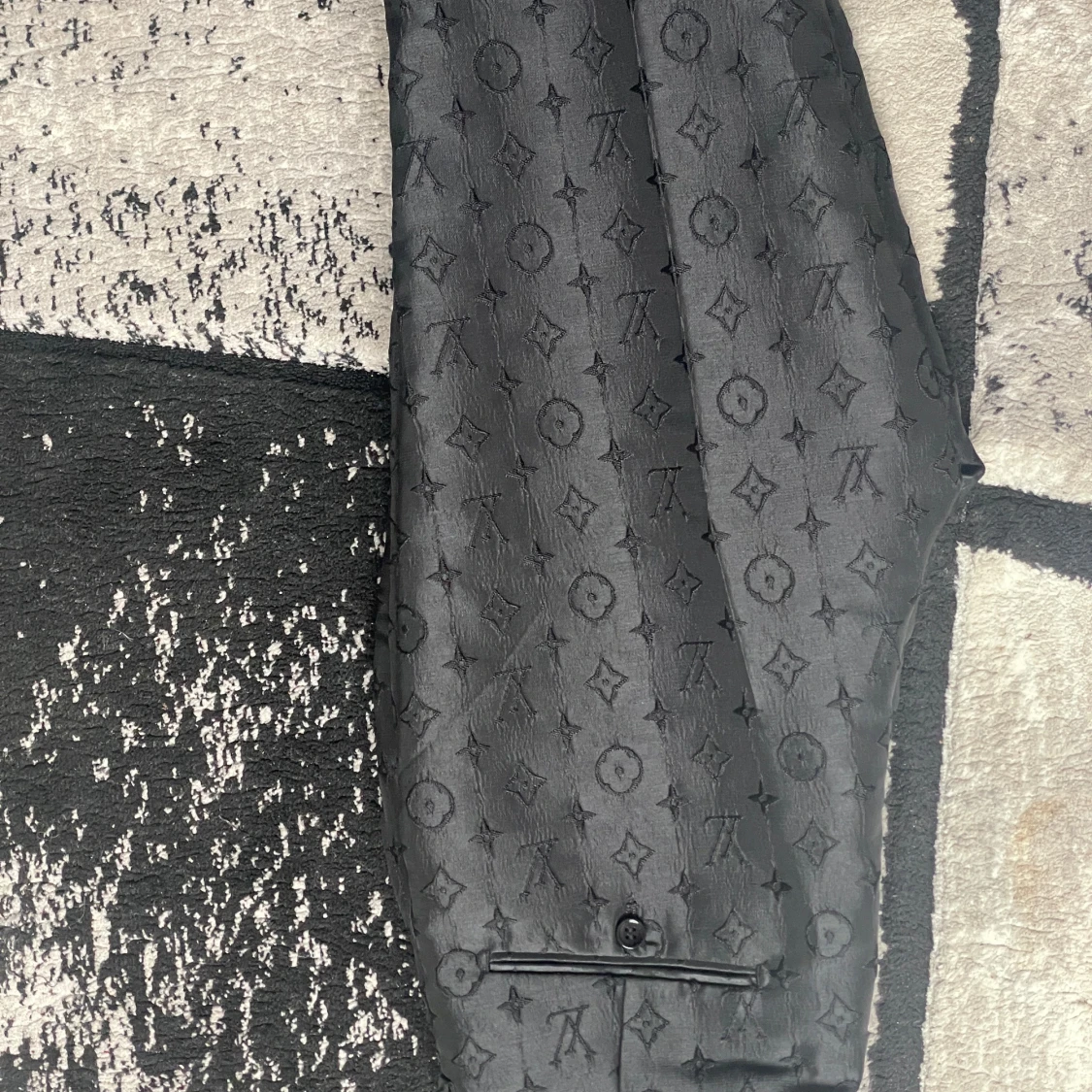 Exklusiv svart kostym från Louis Vuitton med ikoniskt monogrammönster över hela tyget. Kavajen har klassisk passform, två knappar och snygga fickdetaljer. Byxorna är raka och matchar perfekt. Materialet har en lyxig glans och känns riktigt premium.