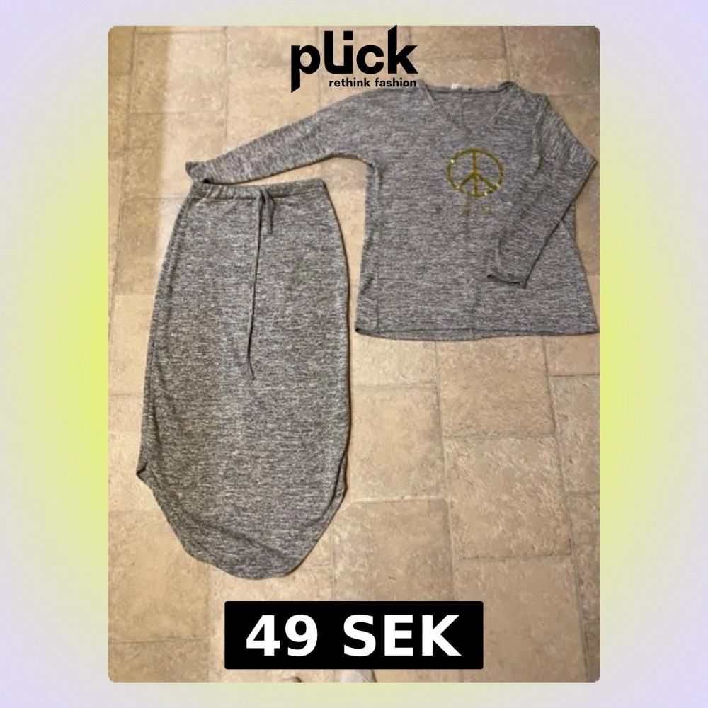 Säljer ett grått mjukis-set från Lo-ika med långärmad tröja och matchande kjol. Tröjan har v-ringning och ett guldigt paljett-peacemärke framtill. Kjolen har snörning i midjan och är rundad nedtill. Perfekt för chill dagar eller när du vill vara bekväm men ändå snygg.