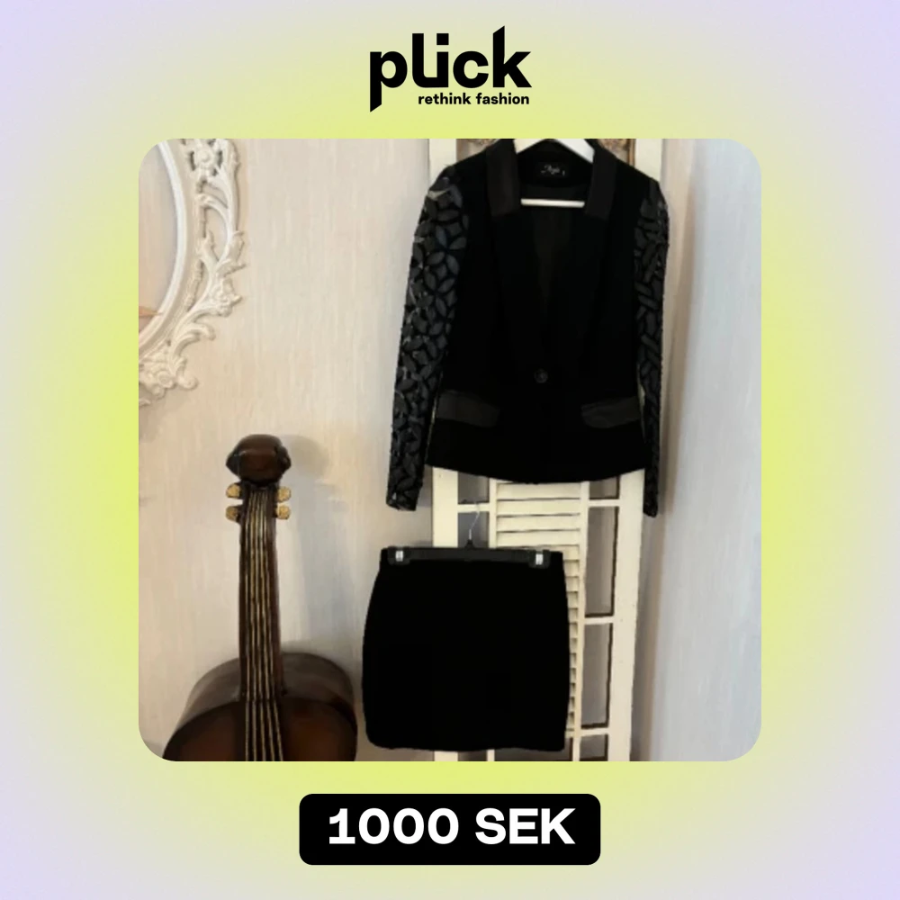 Kostym svart byxor kavaj och kjol i finaste tyg med siden detaljer och ros knapp