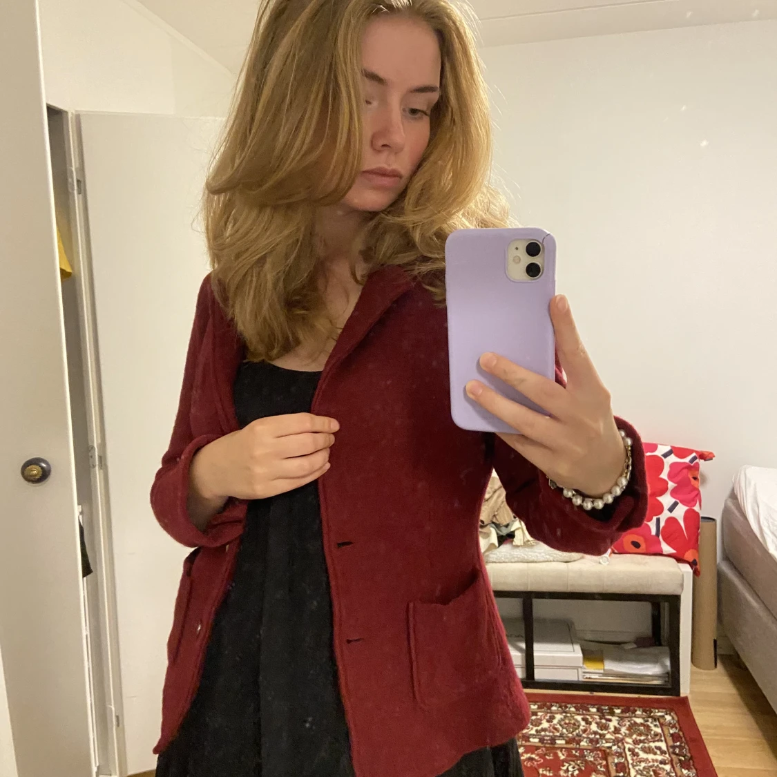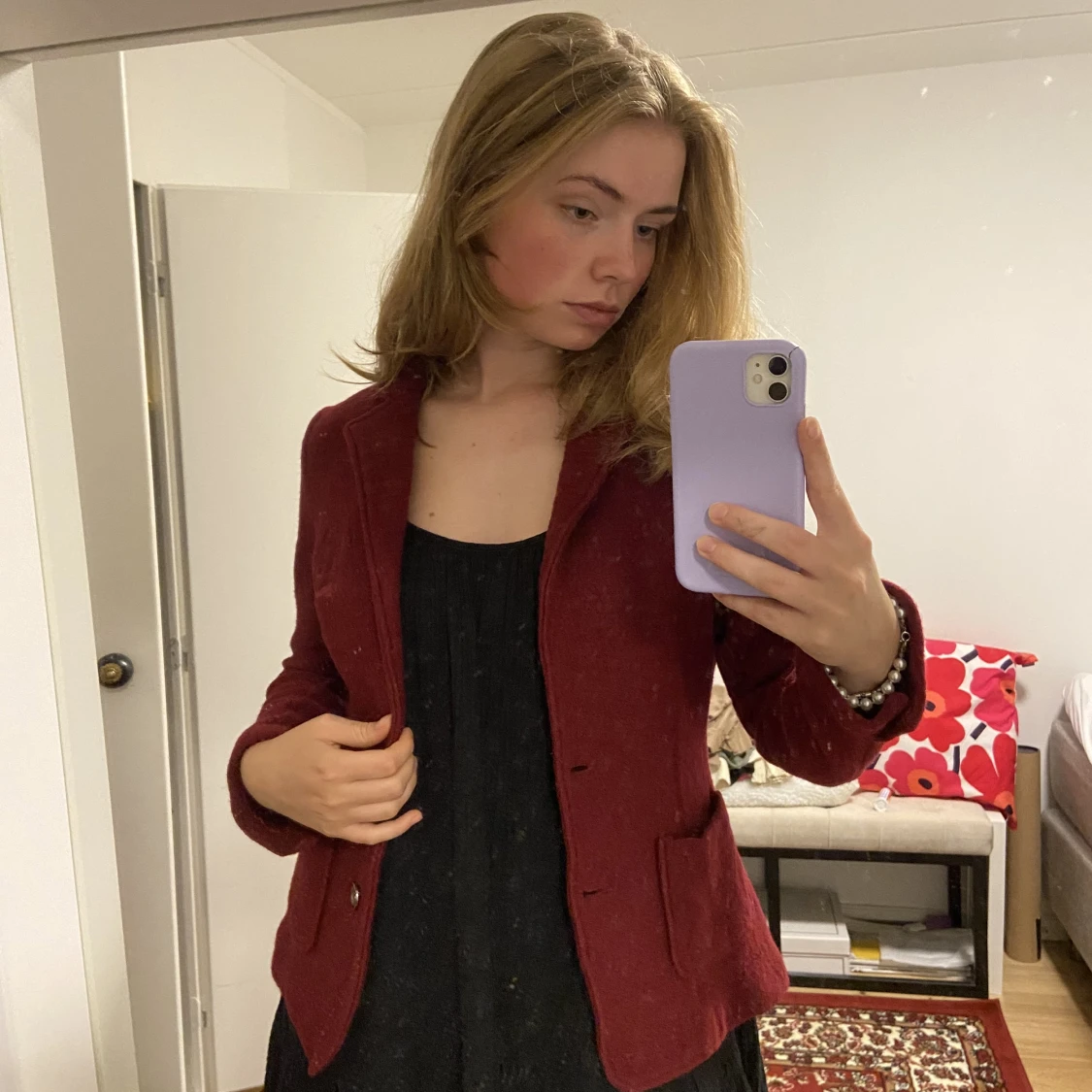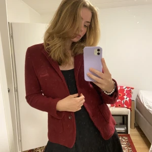 Stickad röd ullkavaj från Stockholm LM Jag är storlek 36 och 173 cm för ref, det står att det är storlek 42 men känns som 36