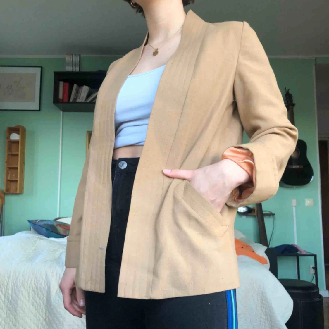 Fin blazer/kimono i linneliknade material med gammalrosa foderđ superfin toffĂ©/kola/ljus brun