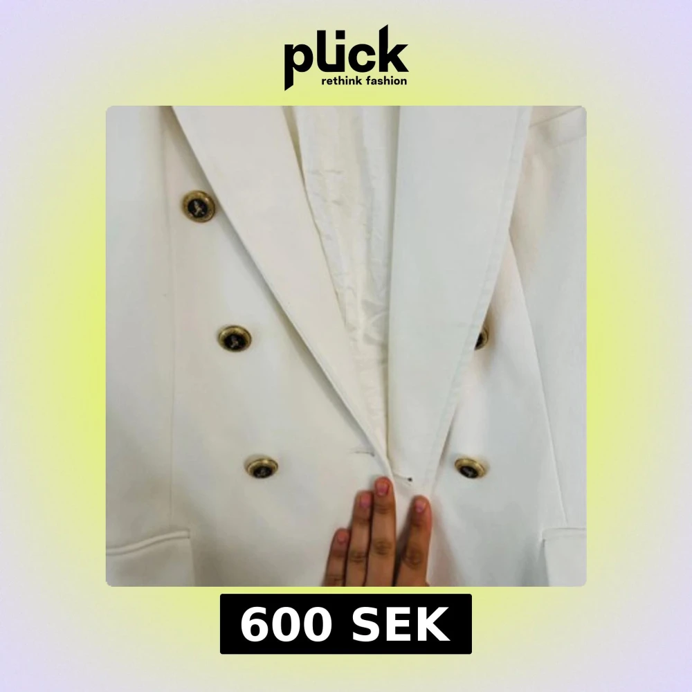 Säljer en stilren vit kavaj från Zara med dubbelknäppning och dekorativa guldknappar. Kavajen har klassisk krage, fickor framtill och är helfodrad. Perfekt för dig som vill ha en clean och snygg look.