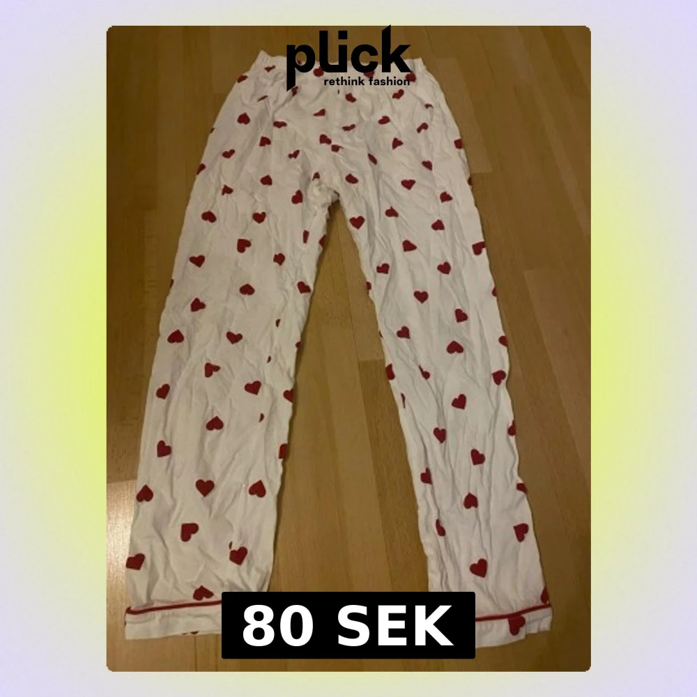 Säljer ett par vita pyjamasbyxor från H&M med gulligt rött hjärtmönster över hela byxan. Byxorna har resår i midjan och är gjorda i mjuk bomull, perfekta för mysiga kvällar hemma. Använda 2 gånger