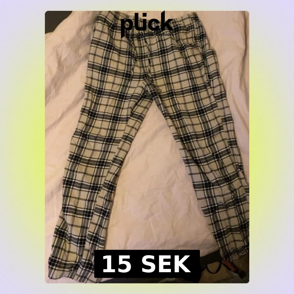 Säljer ett par klassiska pyjamasbyxor med svartvitt rutmönster och dragsko i midjan. Byxorna är tillverkade i mjuk bomull och har en avslappnad passform, perfekta för chillkvällar hemma.