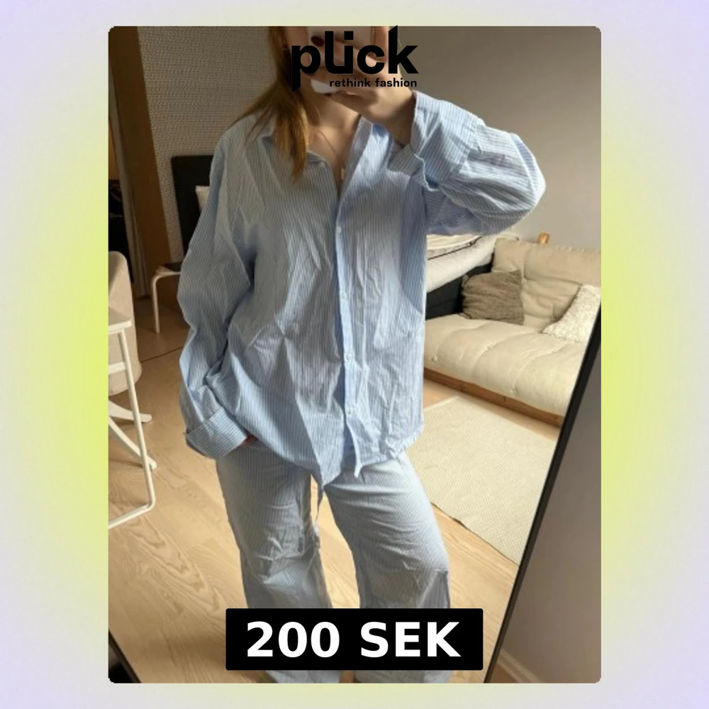 Säljer en klassisk blåvit randig pyjamas med skjorta och byxa i mjuk bomull. Skjortan har knappar framtill och byxan har dragsko i midjan för skön passform. Perfekt för mysiga kvällar hemma.
