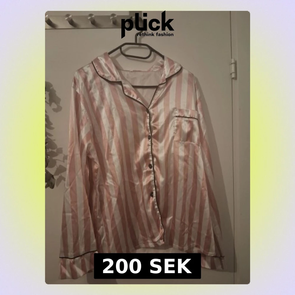 Snygg tvådelad pyjamas i glansigt satinmaterial med breda rosa och vita ränder. Skjortan har svart passpoal, bröstficka och knappar framtill. Byxorna har resår i midjan och matchande svarta detaljer vid benslut. Perfekt för mysiga kvällar hemma.