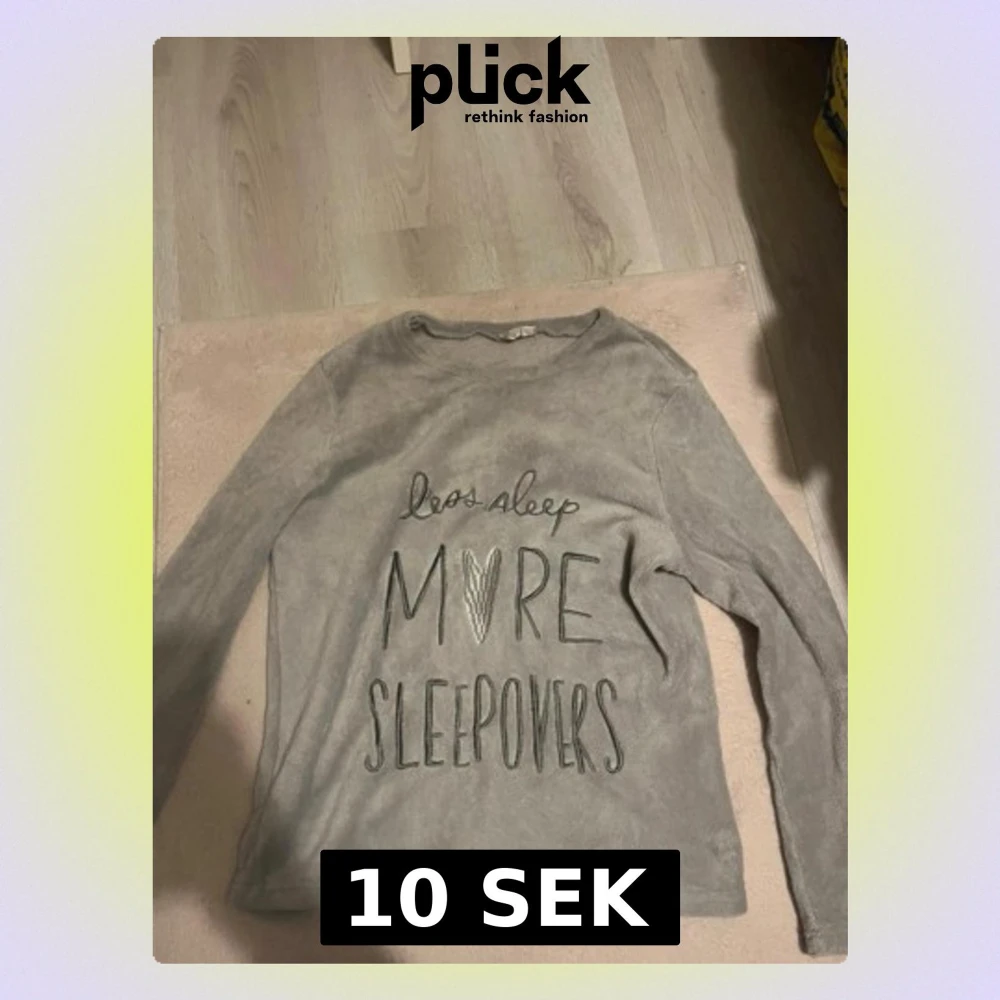 Mysig grå långärmad pyjamastopp i mjukt material med texten 'less sleep MORE SLEEPOVERS' framtill. Perfekt för slappa kvällar och övernattningar. Rund halsringning och avslappnad passform.