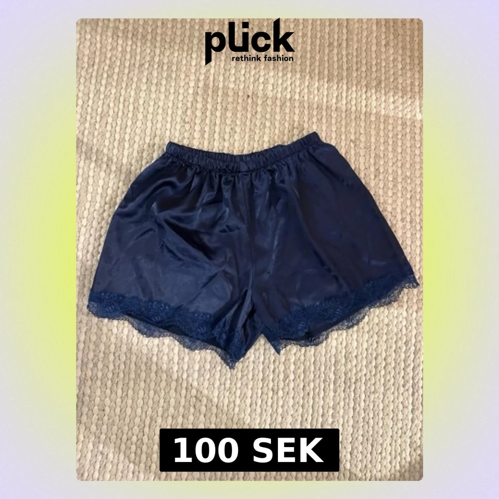 Snygga mörkblå pyjamasshorts i glansigt material med elastisk midja och dekorativ spetskant längst ner. Från Missäy och storlek S/M!