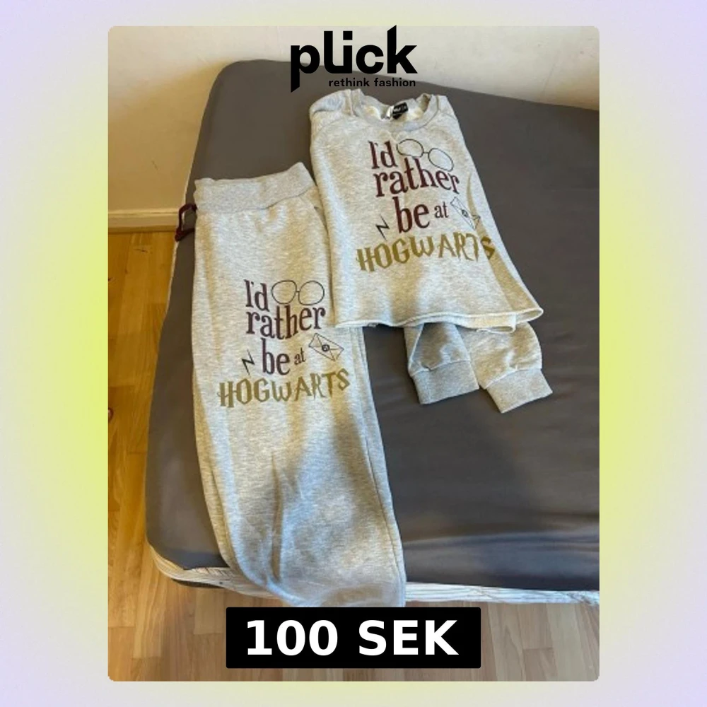 Mysig grå pyjamas med trycket 'I'd rather be at Hogwarts' och Harry Potter-inspirerade detaljer som glasögon, blixt och brev. Setet består av långärmad tröja och byxor med resår i midjan och mudd vid benslut. Perfekt för alla Potterheads som vill chilla hemma.