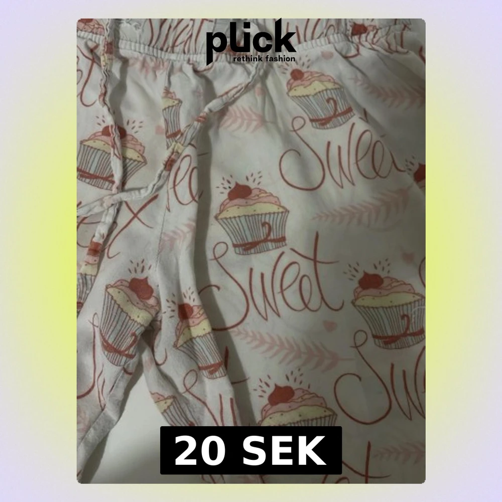Säljer ett par ljusa pyjamasbyxor med gulligt cupcake-mönster och texten 'Sweet' i rosa toner. Byxorna har dragsko i midjan och är perfekta för mysiga hemmakvällar. Materialet känns mjukt och bekvämt mot huden.
