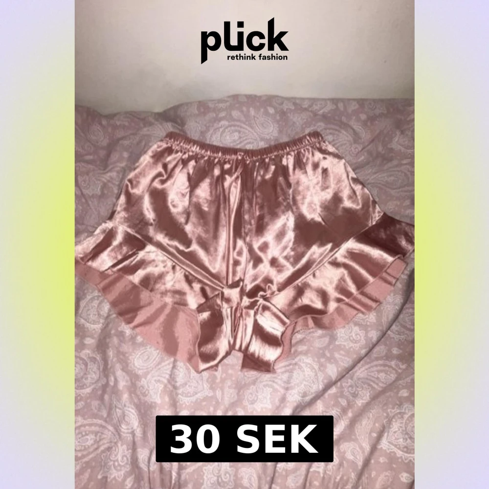 Supersöta pyjamasshorts i glansigt rosa satin med bred volangkant nedtill och elastisk midja. Perfekta för mysiga kvällar hemma och ger en lyxig känsla.