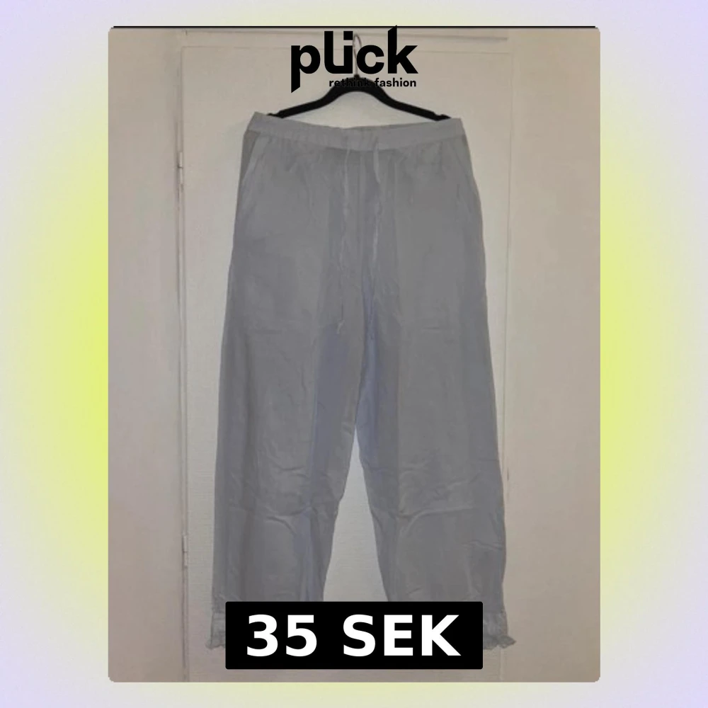 Ljusblå, vida pyjamasbyxor med volanger nedtill, storlek L. Kom gärna med bud!✨