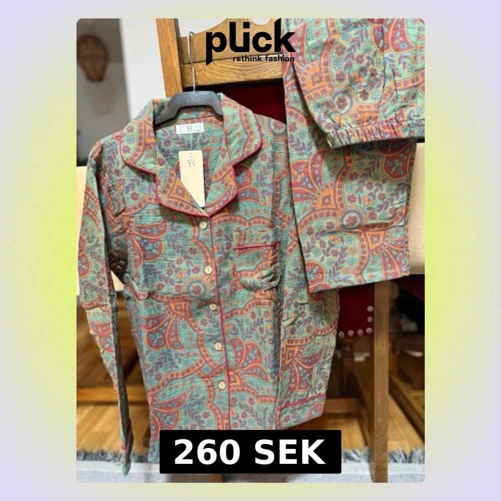 Säljer en färgglad pyjamas från YH med långärmad skjorta och byxor. Setet har ett bohemiskt paisleymönster i grönt, orange, lila och rött. Skjortan har knappar framtill, bröstficka och klassisk krage. Materialet känns mjukt och luftigt, perfekt för chillkvällar. 100% bomull