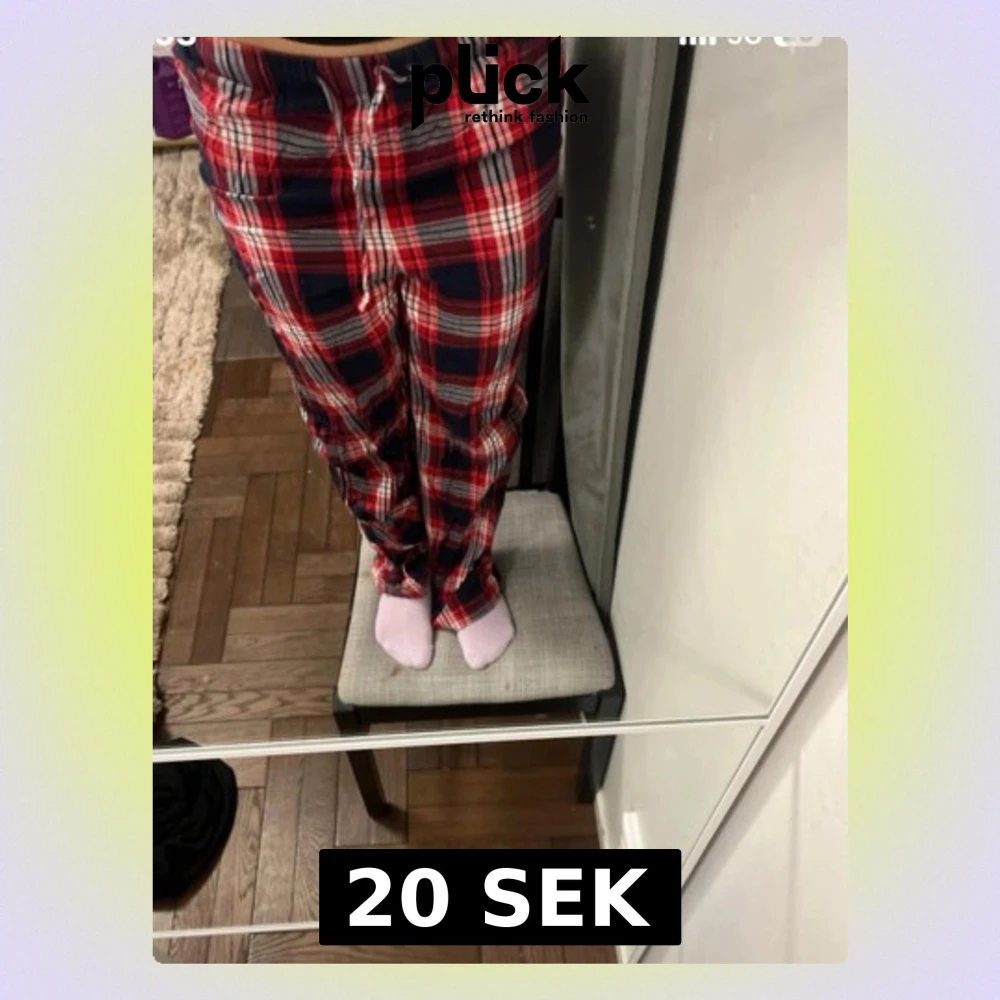 Säljer ett par mysiga pyjamasbyxor med rött, blått och vitt rutmönster. Byxorna har dragsko i midjan och raka ben, perfekta för chillkvällar hemma. Mjukt material som känns skönt mot huden.