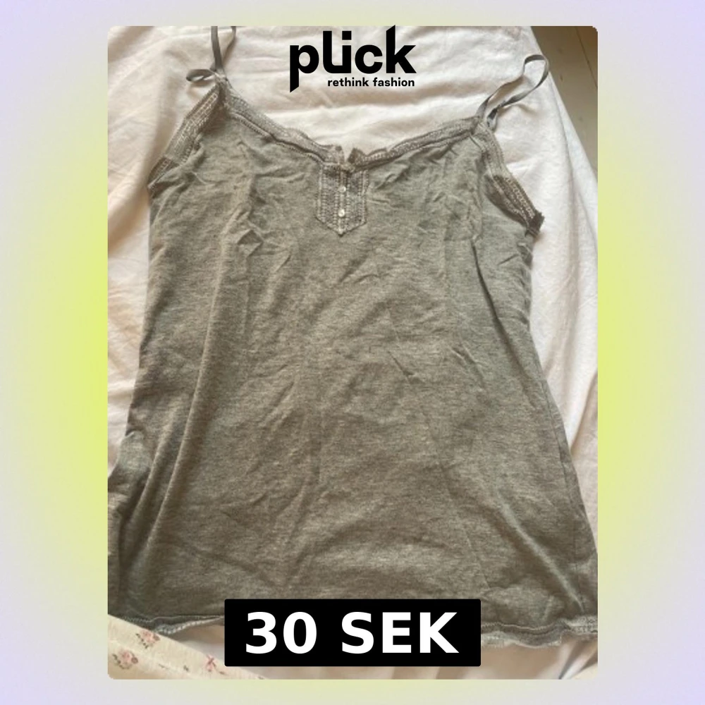 Mysig grå pyjamastopp med tunna axelband och dekorativ spets längs halsringningen. Framtill finns tre små pärlemorknappar och ett broderat mönster. Materialet är mjukt och bekvämt, perfekt för att chilla hemma.