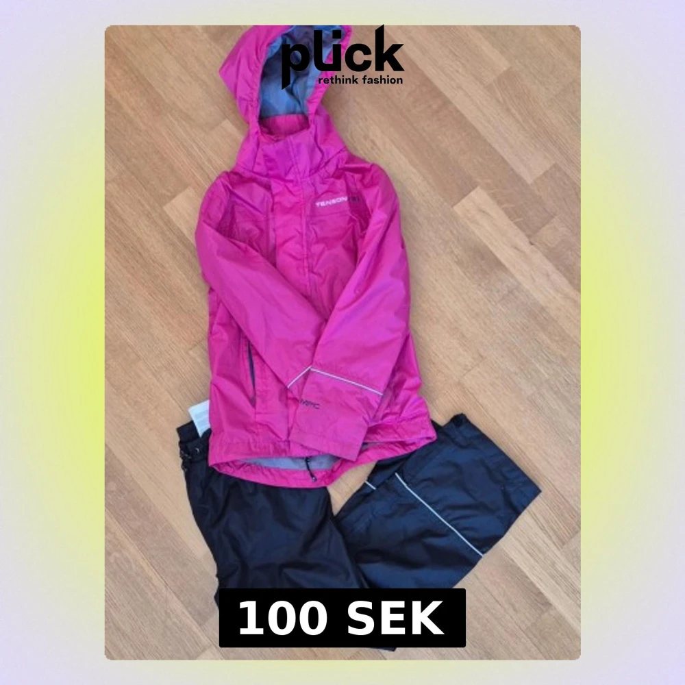 Rosa regnjacka och svarta överdragsbyxor från Tenson