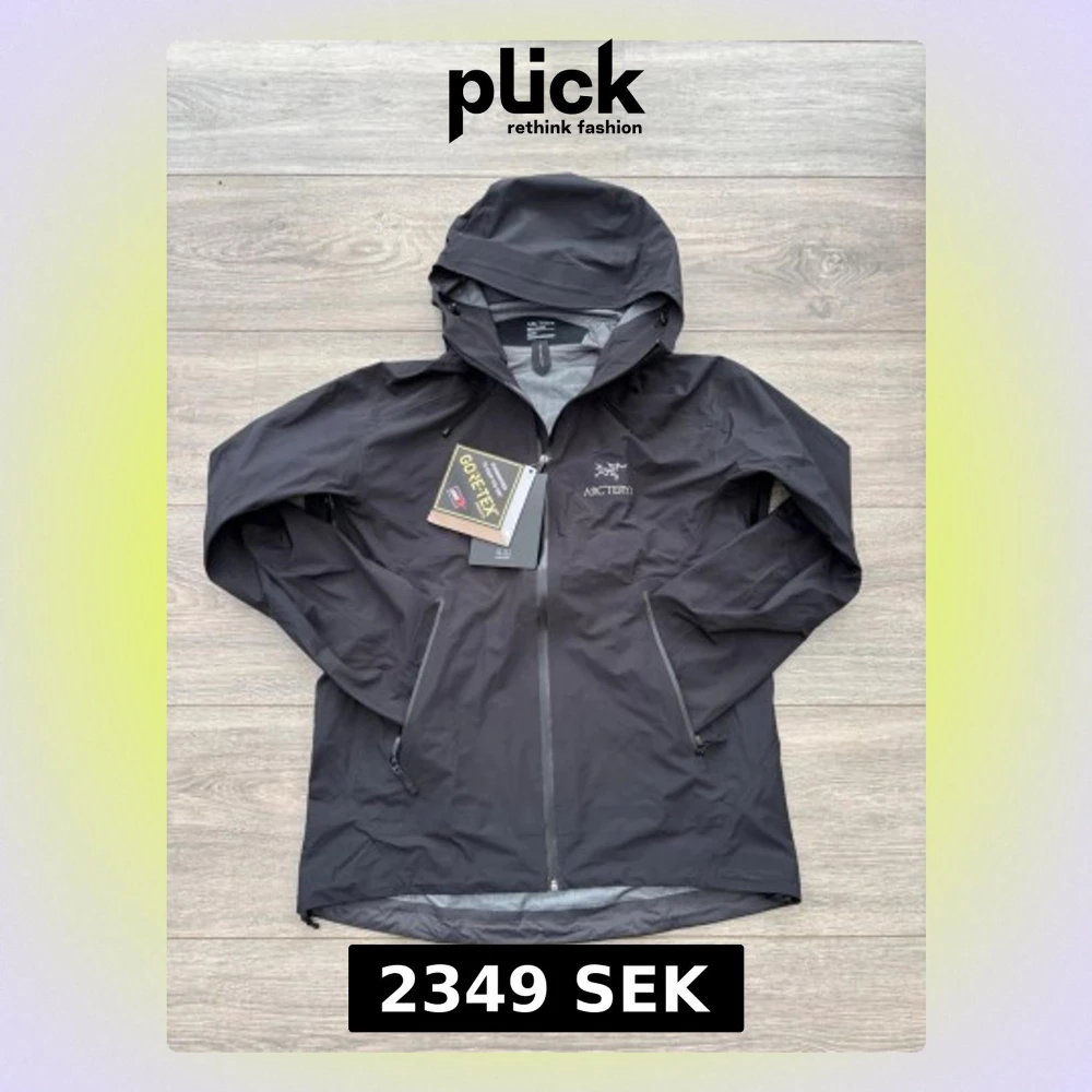 Snygg svart regnjacka från Arc'teryx i herrmodell, tillverkad i slitstark och vattentät Gore-Tex. Jackan har huva, hel dragkedja framtill och två dragkedjeförsedda fickor. Perfekt för regniga dagar och outdoor-äventyr. Kvitto finns på bild men är borttappad. Storlek M. Funkar perfekt till vandring, regn, skidåkning och mycket mer.