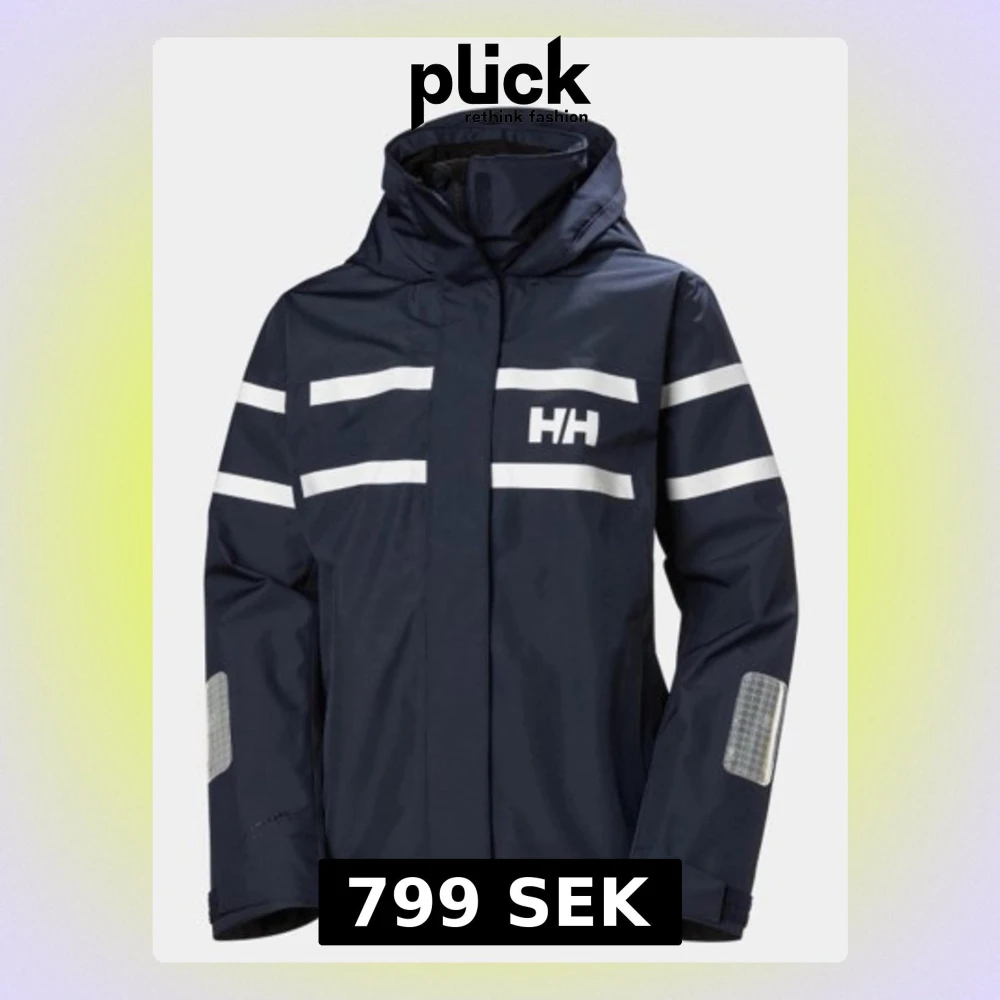 Snygg marinblå regnjacka från Helly Hansen med vita reflexdetaljer på bröstet och ärmarna. Jackan har huva, hög krage och kardborre vid ärmsluten. Tillverkad i vattentätt material, perfekt för regniga dagar. Stora HH-loggan på bröstet ger en sportig look.