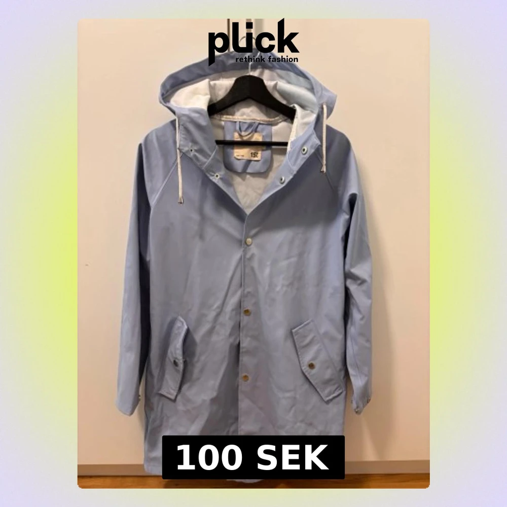 Snygg ljusblå regnjacka med vit insida och dragsko i huvan. Jackan har tryckknappar framtill, två fickor med lock och en rak passform. Perfekt för regniga dagar och enkel att matcha med olika outfits.
