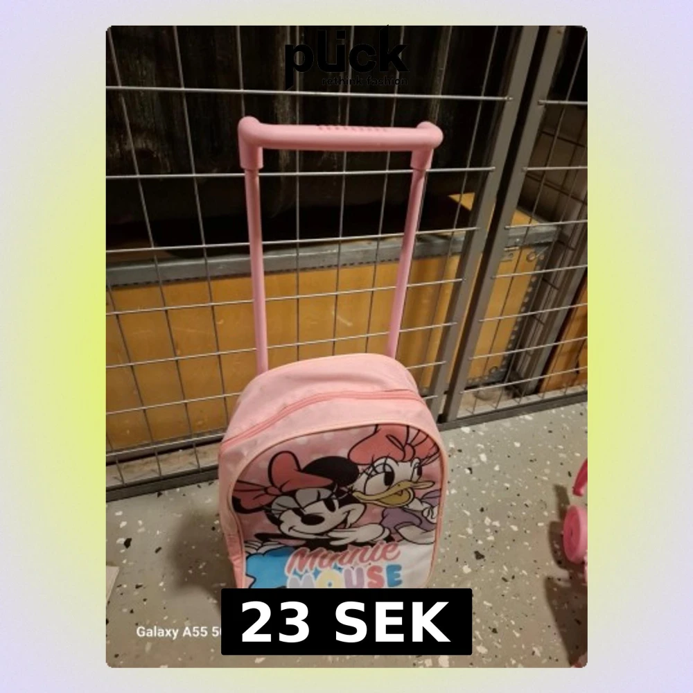 Söt rosa kabinväska med motiv av Minnie Mouse och Kajsa Anka på framsidan. Väskan har utdragbart handtag och två hjul, perfekt för resor eller övernattningar. Tillverkad i slitstark textil med plastdetaljer och dragkedja. Motiv i färgerna rosa, svart, vitt och gult.