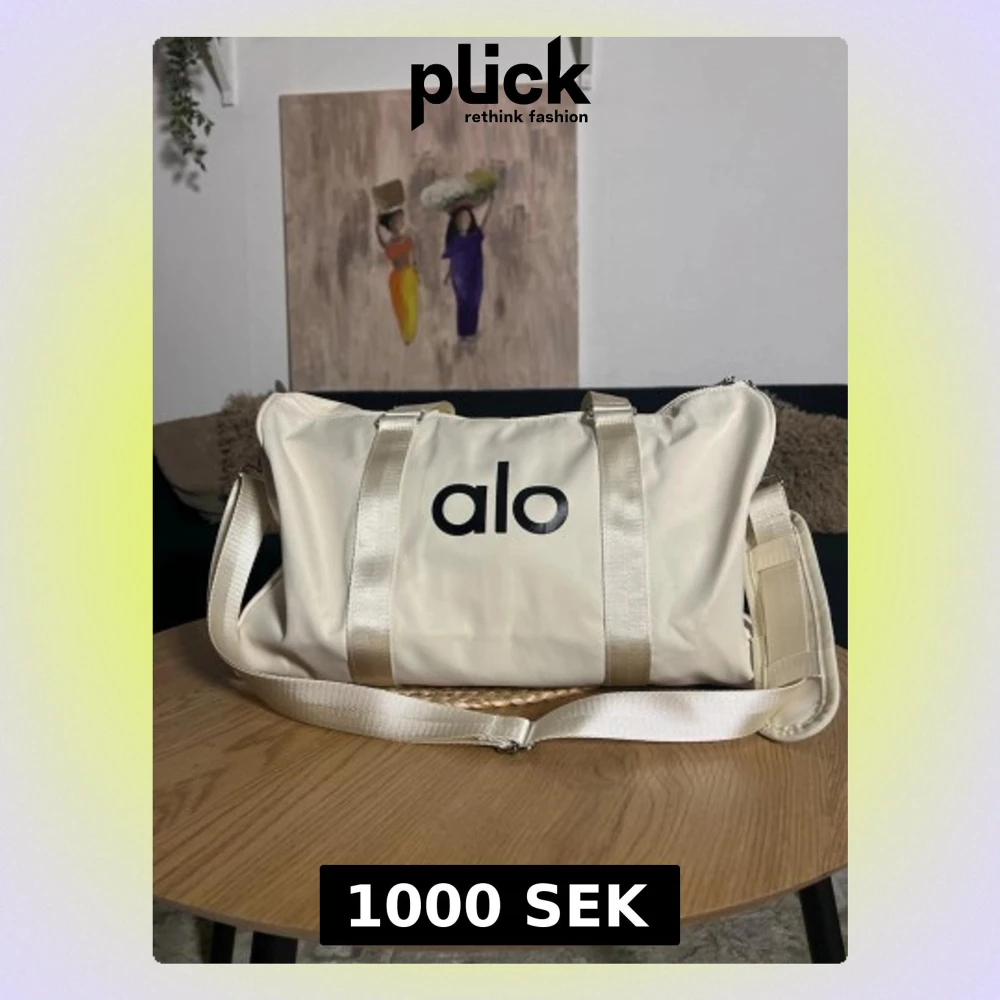 Snygg krämvit duffelväska från Alo med breda, glansiga axelband och justerbar axelrem. Väskan har en stilren design med Alo-loggan tryckt i svart framtill. Tillverkad i slitstarkt syntetmaterial och perfekt för resor eller gymmet.