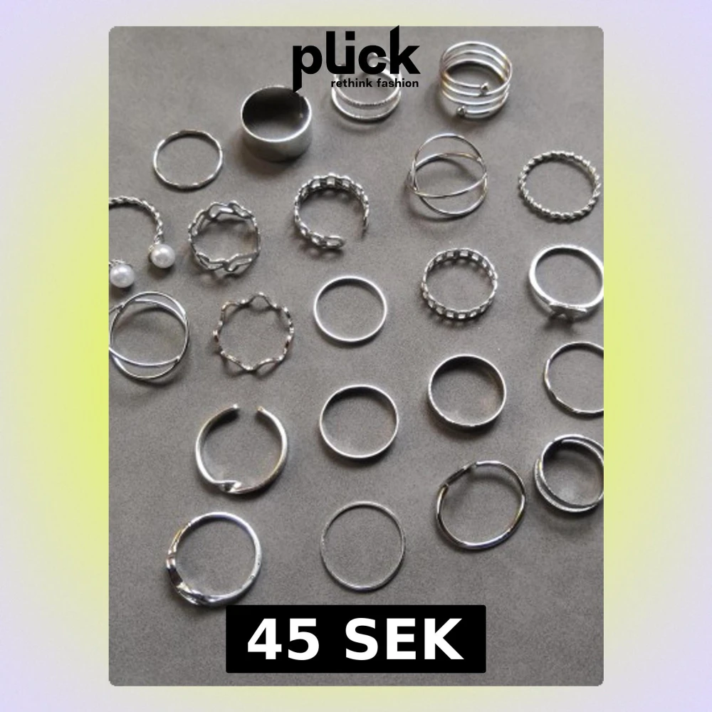22 st ringar med olika former och mönster. Materialet är alloy. (#607)