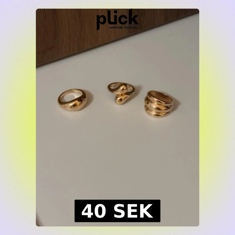 Säljer ett set med tre guldfärgade ringar från Montini. Ringarna har olika former: en klassisk rund, en med tvinnad design och en med öppen, vågig form. Tillverkade av oädla material och perfekta för att ge din look en trendig touch. De är antingen i storlek 17,18 eller 19 är ej säker. Har aldrig använt
