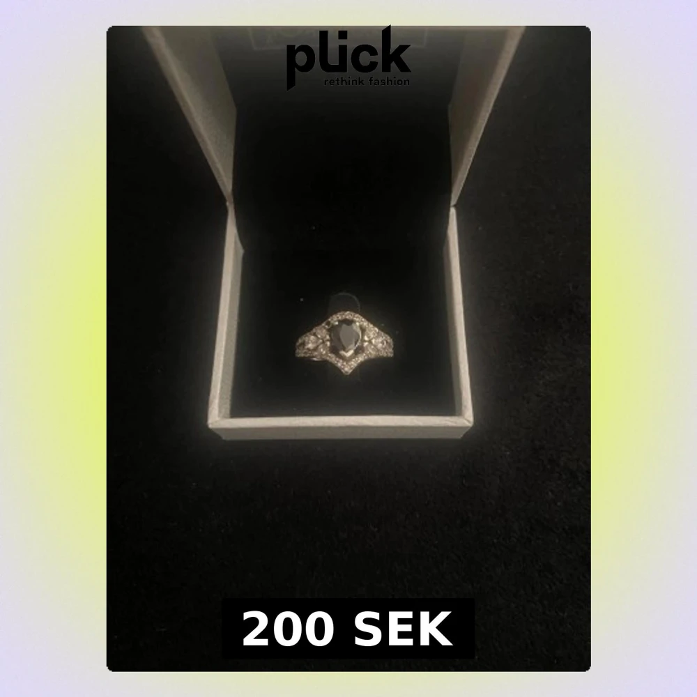 Snygg silverfärgad ring med en stor svart sten i mitten och små gnistrande kristaller runt om. Ringen har en elegant och unik form som verkligen sticker ut. Perfekt accessoar för att lyfta din stil.