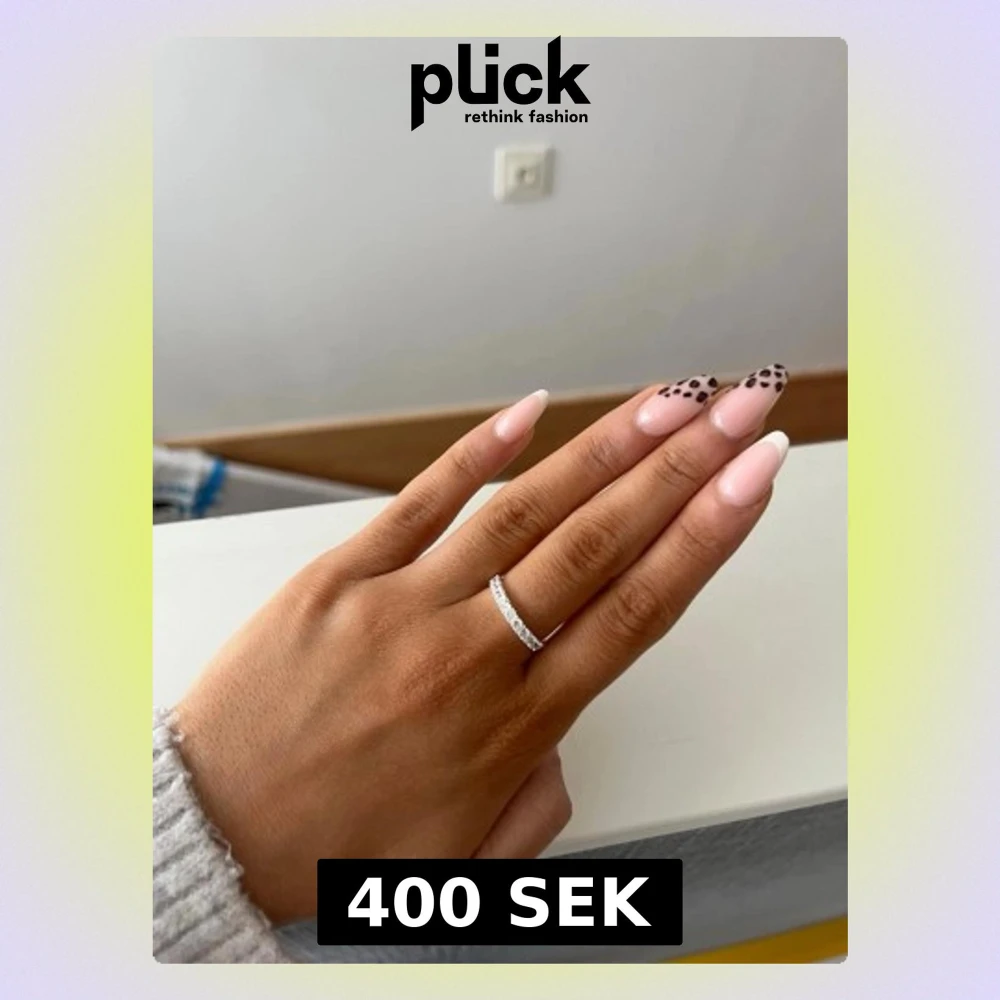 Äkta silver ring med rad av stenar i Cubic Zirconia. Ringen är i sterling silver 18 karat guld. Den är i storlek 17, vilket motsvarar en S. Den sitter lite löst på mitt ring finger men perfekt på mitt långfinger. Finns inga defekter på ringen.