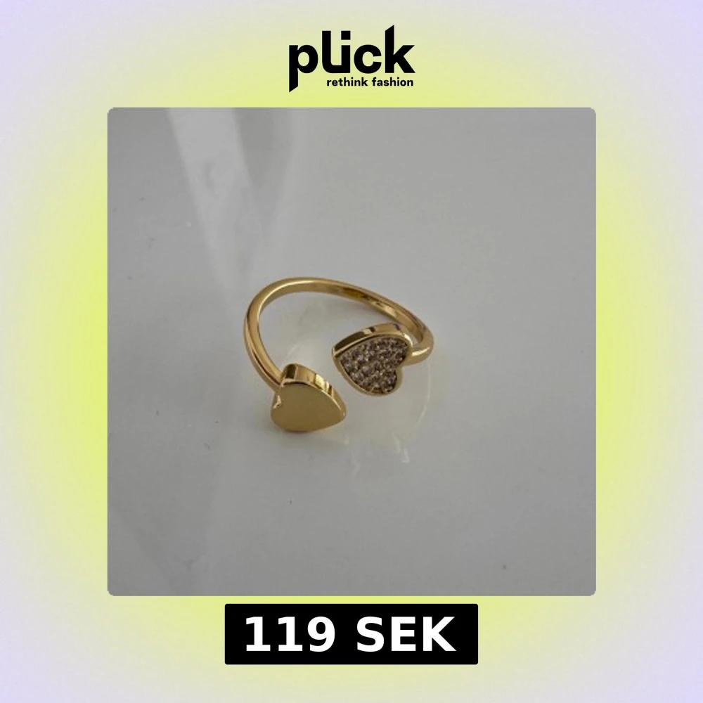 Trendig guldfärgad ring med öppen design och två hjärtformade detaljer. Ena hjärtat är slätt medan det andra är dekorerat med små glittrande stenar för extra bling. Perfekt accessoar för att lyfta din stil.
