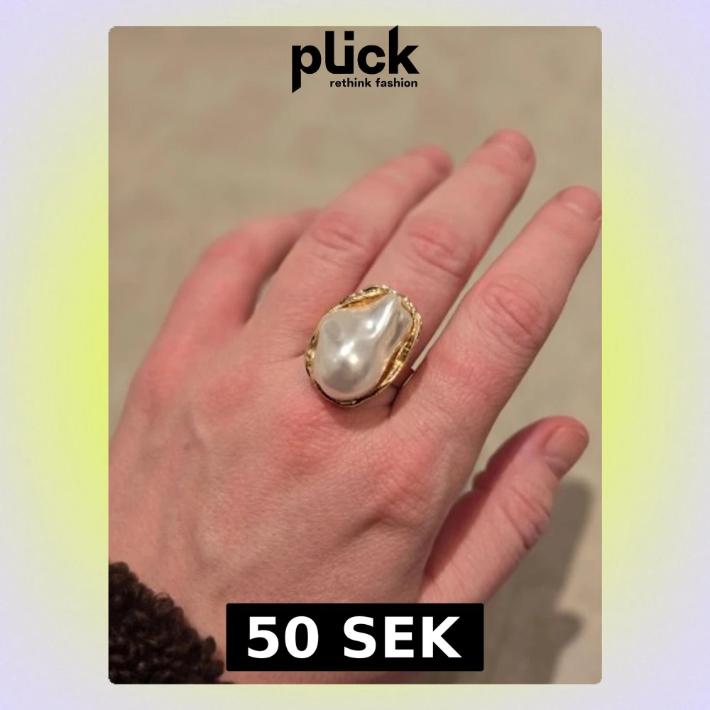 Unik ring med en stor, oregelbunden pärlliknande detalj i vitt, infattad i guldfärgad metall. Ringen har en chunky design som verkligen drar blickarna till sig. Perfekt för dig som gillar att sticka ut med accessoarer. Justerbar storlek