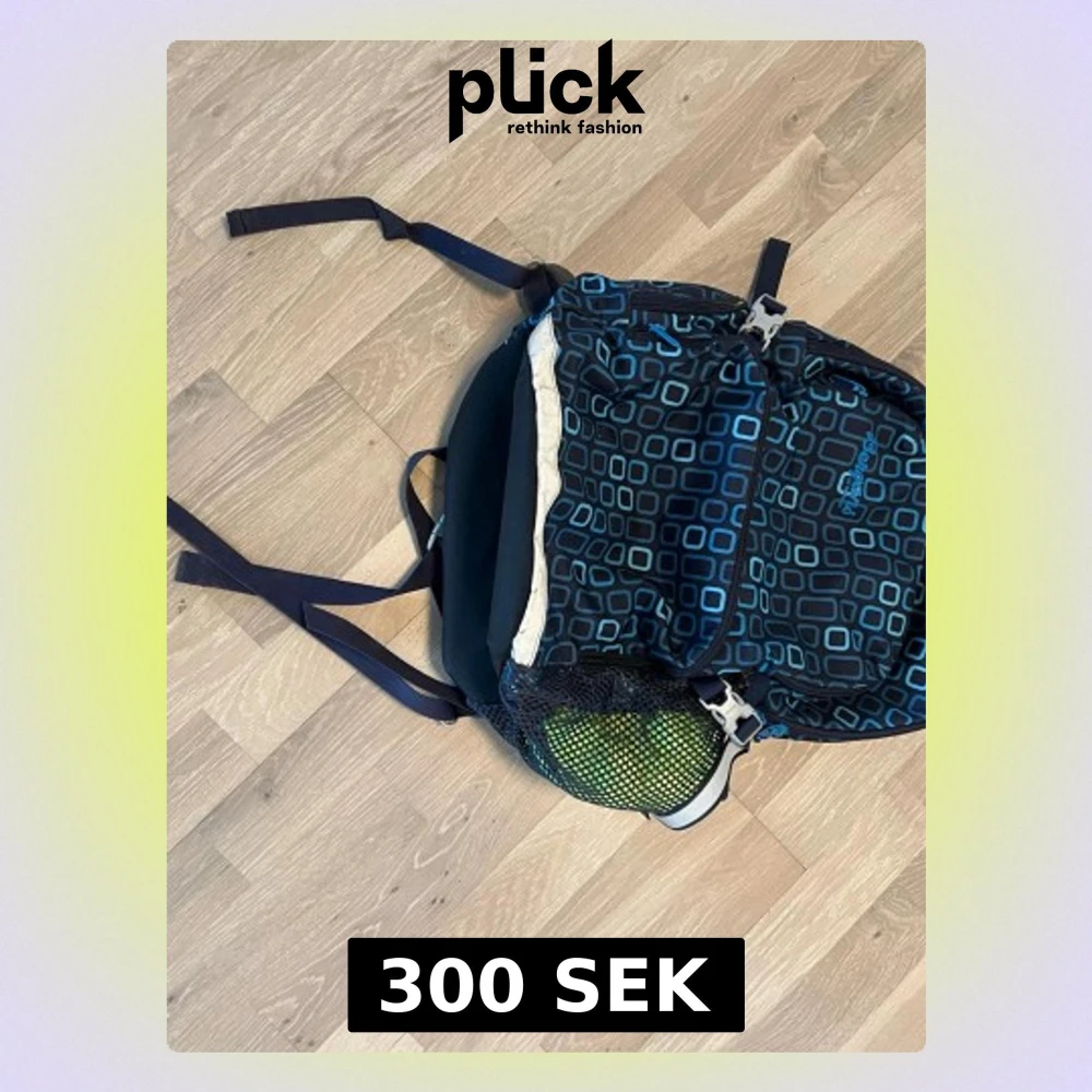 Säljer en snygg blå ryggsäck från Bergans med geometriskt mönster i turkost. Ryggsäcken har flera justerbara remmar, meshficka på sidan och smarta spännen. Perfekt för dig som gillar att vara aktiv och vill ha en cool och praktisk väska.