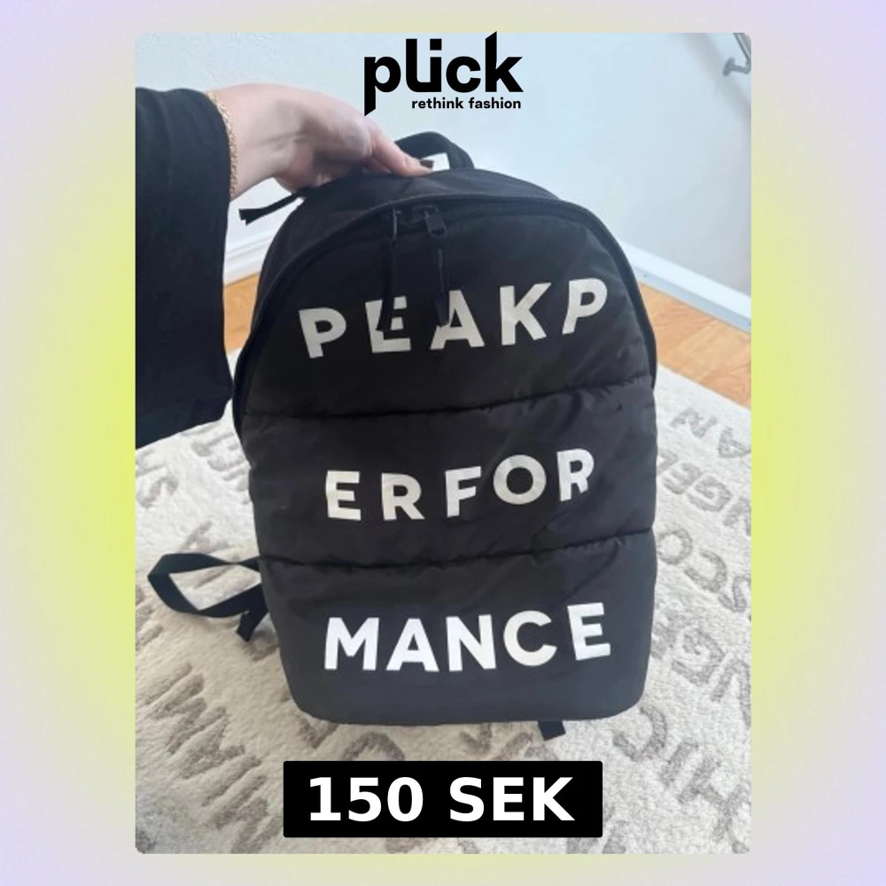 Snygg svart ryggsäck från Peak Performance med stora vita bokstäver på framsidan. Ryggsäcken har dragkedja upptill, justerbara axelband och ett vadderat material som ger en cool look. Perfekt för skola eller träning.