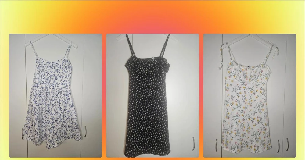 Vit blommig sommarklänning H&M Divided - Söt vit kortklänning från H&M Divided med blommigt mönster i gult och rosa. Klänningen har smala axelband med knyt och en lätt, luftig känsla. Perfekt för varma dagar och enkel att styla med sneakers eller sandaler.
