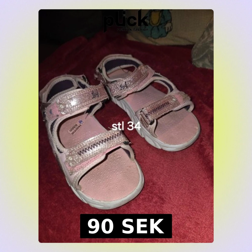 Säljer ett par ljusrosa sandaler från Leaf i storlek 34. De har glittriga remmar med kardborrestängning och vit sula. Insidan är mjukt vadderad för extra komfort och sandalerna har en sportig look. Perfekta för sommaren!