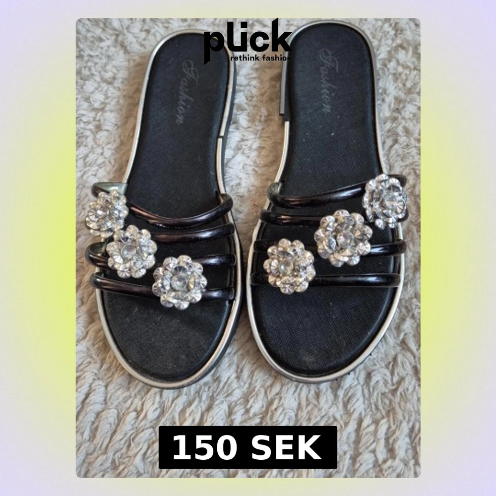 Snygga svarta sandaler med tre tunna remmar och stora blommiga strassdetaljer på ovansidan. Sandalerna har en platt sula och silverfärgade kanter som ger en extra touch. Perfekta för att lyfta din sommarstil.