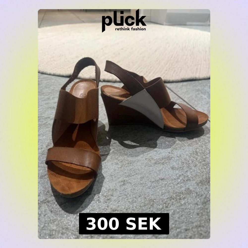 Snygga sandaler med kilklack i brunt konstläder och breda remmar. De har öppen tå och elastiskt band runt hälen för skön passform. Klacken har en kontrastdetalj i vitt på sidan som ger en modern touch. Perfekta för sommarens alla outfits.
