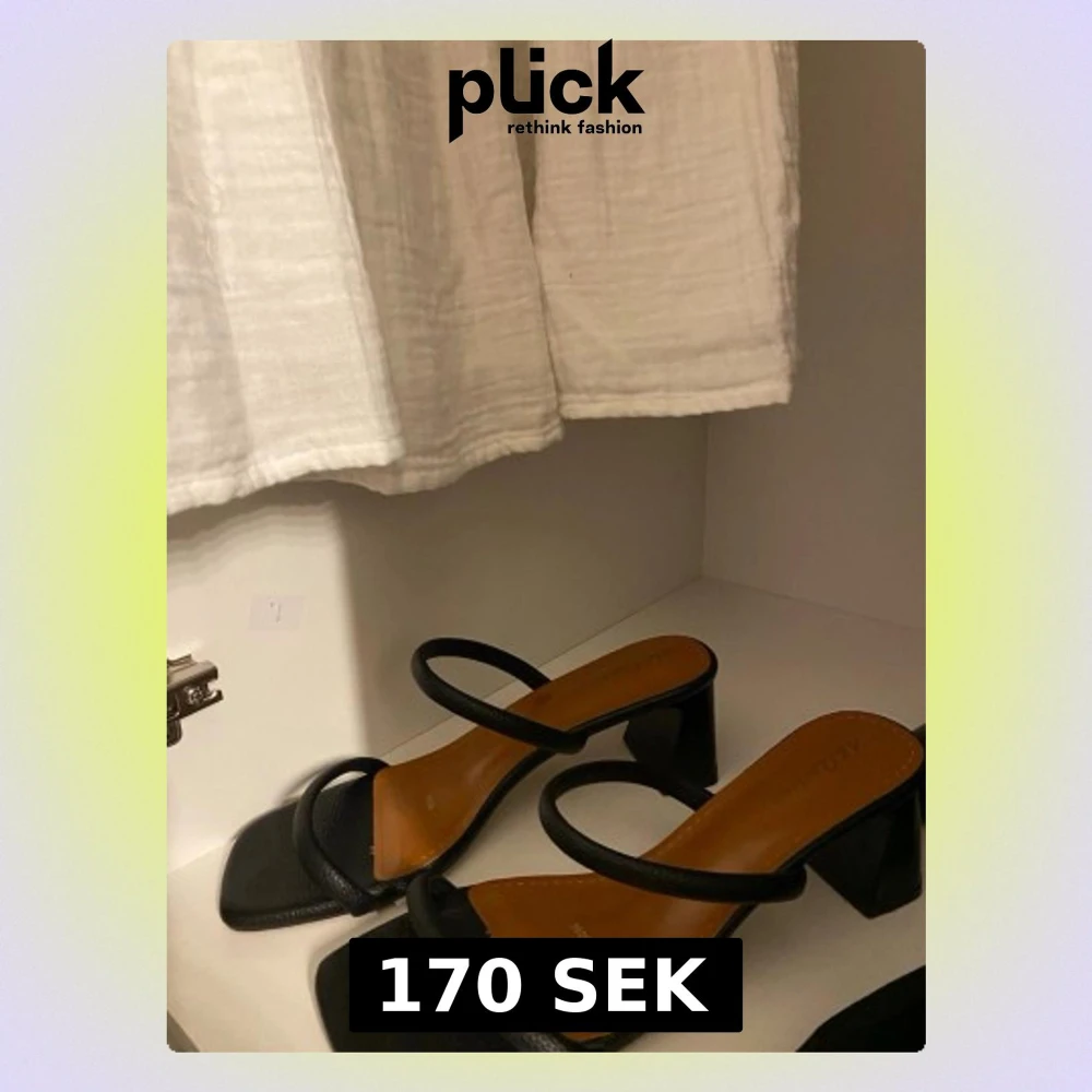 svarta låga klackar med fyrkantig tå, två tunna band över foten. Klackarna har en låg, stabil klack och innersula i brunt. Perfekta för dig som letar efter ett par med låg klack och vill ha något som matchar till allt. Har kommit till användning 1 gång pgr av att dem är lite för stora.