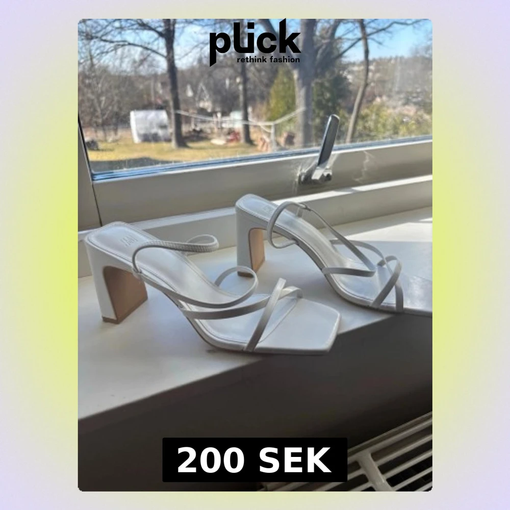 Säljer ett par stilrena vita sandaletter med fyrkantig tå och tunna remmar. Skorna har en hög blockklack och öppen häl, vilket ger en modern och trendig look. Perfekta för dig som vill ha en clean och minimalistisk stil. Materialet ser ut att vara konstläder.