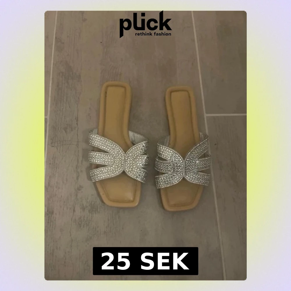 Säljer ett par snygga slip-in sandaler med fyrkantig tå och breda band täckta av silverfärgad strass. Sulan är beige och har en mjuk look. Perfekta för dig som vill ha något extra till outfiten. Märke ej synligt.