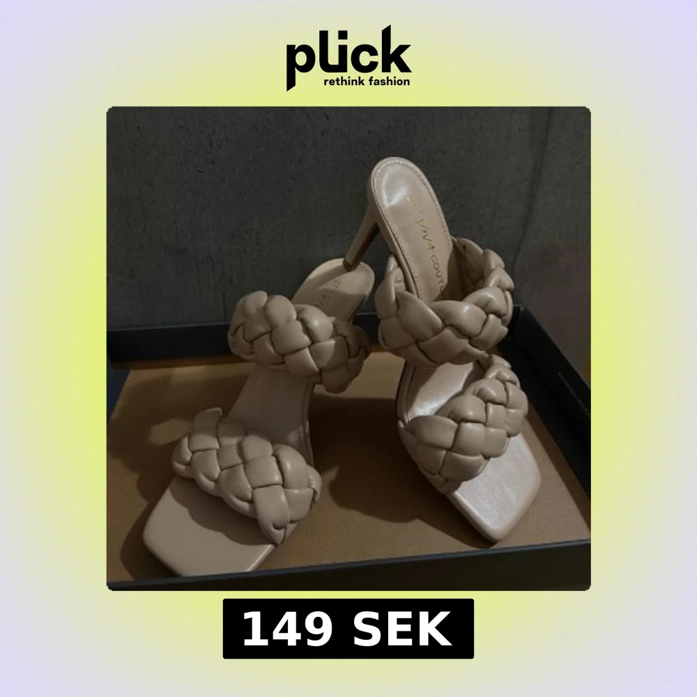 Säljer ett par trendiga beige sandaler med höga klackar och två breda, flätade remmar. Sandalerna har fyrkantig tå och är tillverkade i ett mjukt, skinnliknande material. Perfekta för dig som vill ha en stilren och modern look.