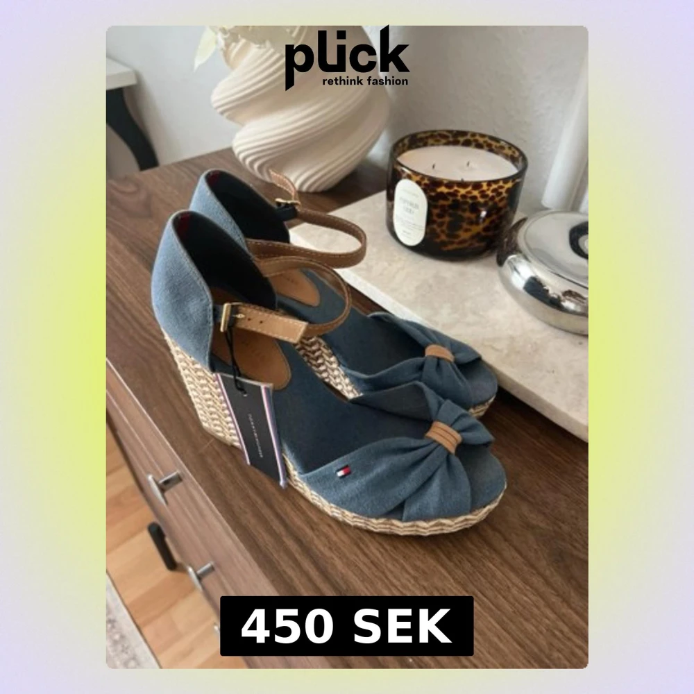 Snygga blå kilklackssandaler från Tommy Hilfiger med flätad sula och rosett framtill. Sandalerna har en justerbar rem runt ankeln i beige läderimitation och små logodetaljer på sidan. Perfekta för sommaren och ger en avslappnad men trendig look. (Är själv 38/39)