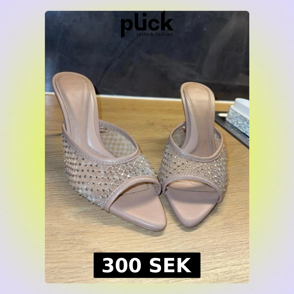 Säljer ett par snygga slip-in sandaler i beige med nätmönster och glittriga stenar på ovandelen. Sandalerna har öppen tå och låg klack, samt en modern fyrkantig tåform. Perfekta för dig som vill ha något trendigt och bekvämt.