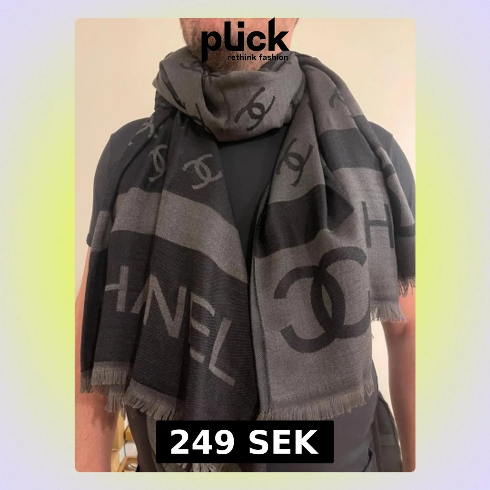 Snygg mörkgrå halsduk från Chanell med stora logotyper och text i svart och ljusgrått. Halsduken har fransade kanter och är tillverkad i ett mjukt, vävt material som känns lyxigt och stilrent. Perfekt accessoar för att lyfta din outfit.