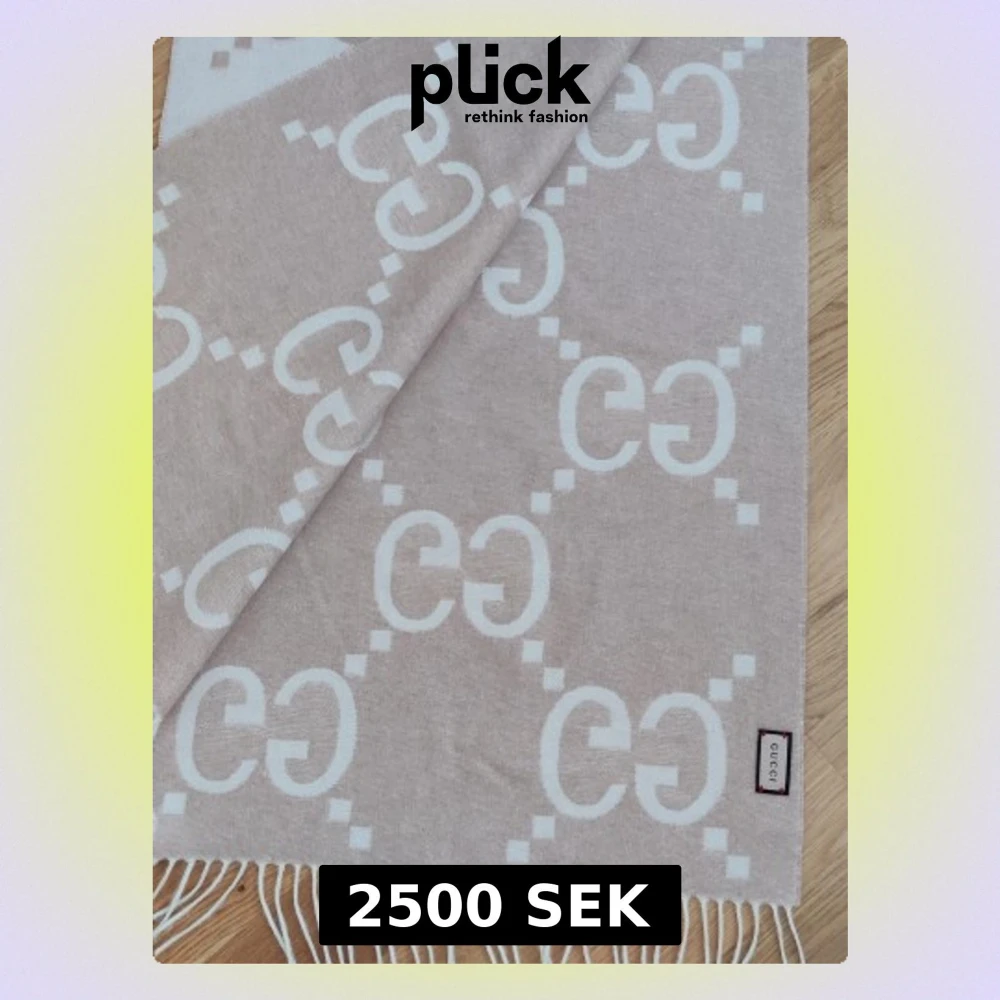 Snygg beige halsduk med ikoniskt GG-mönster i vitt och dekorativa fransar i kanterna. Ull.
