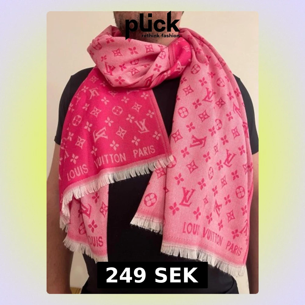 Lyxig rosa halsduk från Vuitton med ikoniskt monogrammönster och texten ' Vuitton Paris' längs kanten. Halsduken har vita fransar och är tillverkad i ett mjukt tyg som känns skönt mot huden. Perfekt accessoar för att lyfta din outfit.