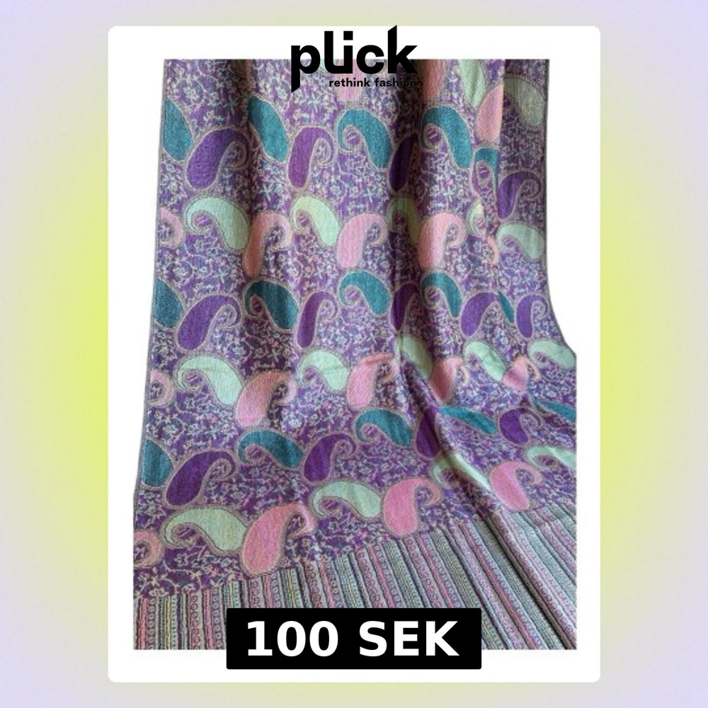 Sjal med paisleymönster i lila, rosa, mintgrönt och turkost. Materialet ser ut att vara mjukt och vävt, med fransar i ändarna och randigt avslut. Perfekt för att ge din outfit en färgklick och bohemisk känsla.