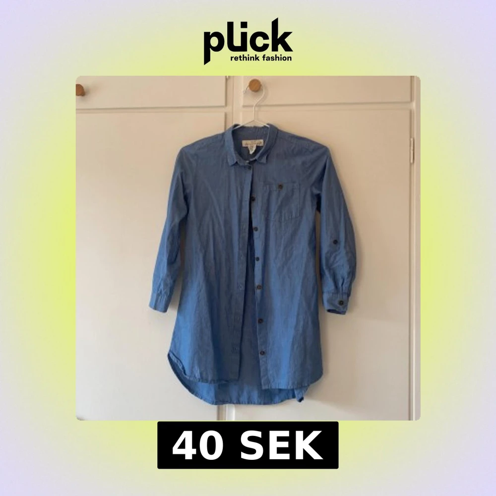 Säljer en blå skjorta från L.O.G.G. med trekvartsärmar och knappar framtill. Skjortan är tillverkad i ett lätt och tunt material. Kan även användas som en klänning