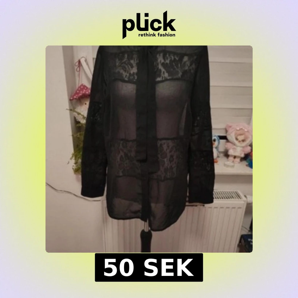 Säljer en svart transparent blus med spetsdetaljer och knytband vid halsen. Skitsnygg om man stylar rätt!